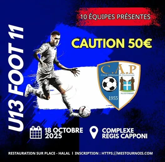 Le CA Peymeinade organise son grand tournoi U13 Foot à 11 le samedi 18 octobre 2025, au Complexe Régis Capponi. Cet événement réunira 10 équipes venues de la région et d’ailleurs pour une journée placée sous le signe du football, du fair-play et de la convivialité.
