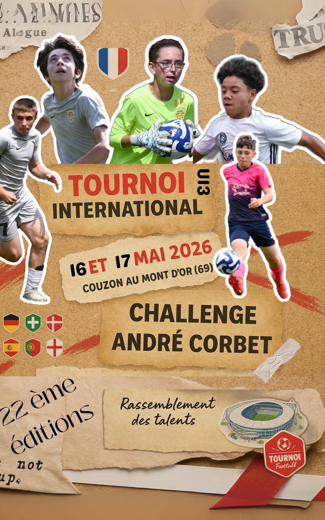 Le Saône Mont d’Or FC, situé à seulement 20 minutes de Lyon, organise la 22ème édition du Tournoi International U13 – Challenge André Corbet les 16 et 17 mai 2026 au stade de Couzon-au-Mont-d’Or (Rhône, Auvergne-Rhône-Alpes). Ce tournoi, désormais reconnu comme une référence, accueillera des équipes U13 masculines et U13F en format foot à 8.