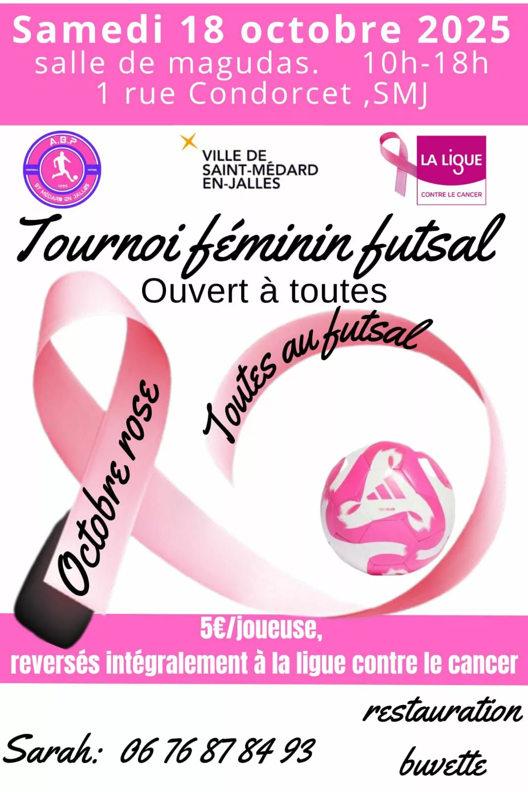 Le club ABP Saint-Médard-en-Jalles organise un tournoi féminin futsal Seniors F le samedi 18 octobre 2025, dans le cadre d’Octobre Rose 🎀. Cet événement solidaire et sportif se déroulera à la salle de Magudas, 1 rue Condorcet, à Saint-Médard-en-Jalles (Gironde, 33).